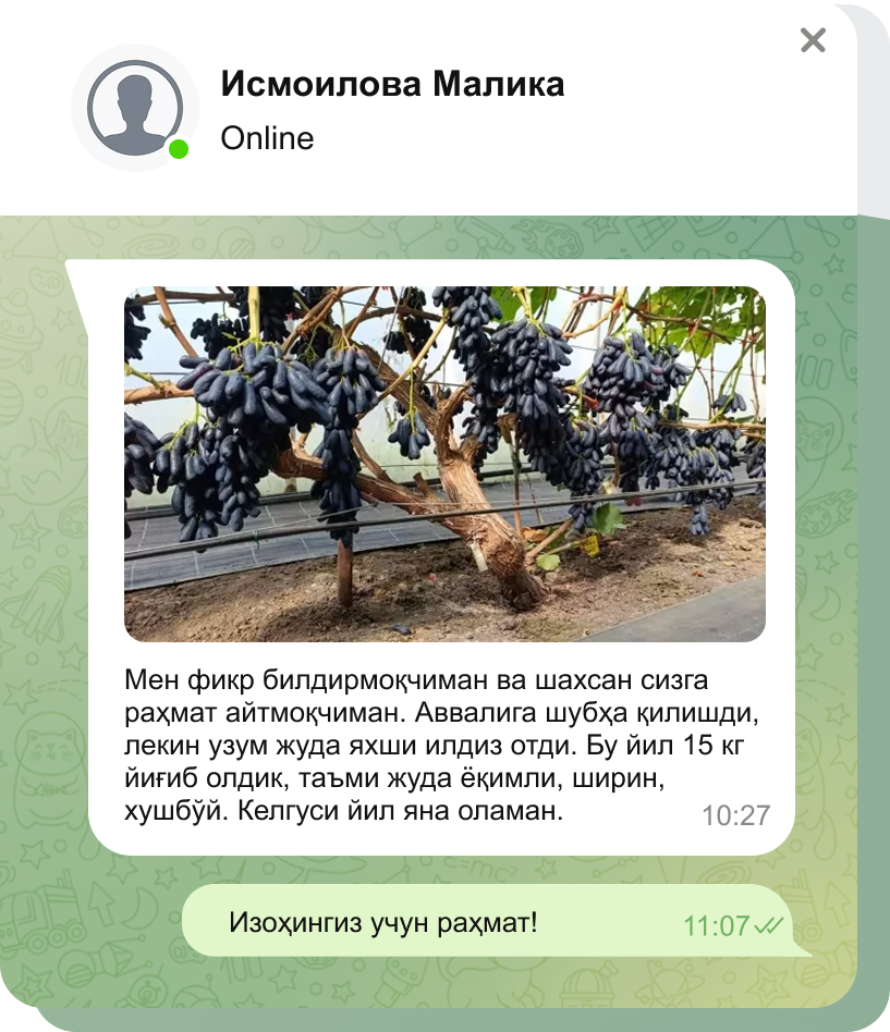 Тўғри экиш ва парваришлаш билан узум сизни мўл ҳосил билан хурсанд қилади.